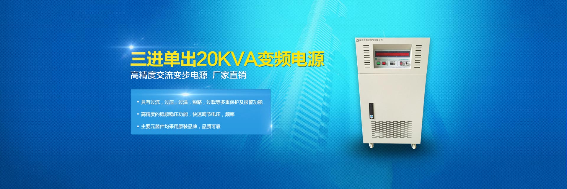 20年變頻電源制造品質(zhì)-陽宏變頻電源為您提供5KVA變頻電源,10KVA變頻電源,20KVA變頻電源,30KVA變頻電源,45KVA變頻電源,60KVA變頻電源,75KVA變頻電源,深圳單相/三相/交流變頻電源等。 模擬式變頻電源,晶體管式變頻電源,可編程式變頻電源,單相大功率變頻電源,三相大功率變頻電源是陽宏電源股份有限公司的核心產(chǎn)品。深圳市陽宏電氣有限公司隸屬臺灣陽宏電源股份有限公司,是一家變頻電源開發(fā)、研制、生產(chǎn)、銷售和服務(wù)的高新技術(shù)企業(yè)。其大陸工廠:深圳市陽宏電氣有限公司,是臺灣陽宏電源股份有限公司在中國大陸一家分公司,地址:深圳市寶安區(qū)觀瀾街道觀瀾高新科技園區(qū)。 臺灣陽宏電源股份有限公司創(chuàng)建于1995年,目前除了臺北公司以外,在中國的廣東深圳設(shè)有分公司,工廠擁有許多的先進設(shè)備。具有年產(chǎn)各種電子儀器電源設(shè)備20000臺以上,工廠有嚴格的生產(chǎn)能力,強大的開發(fā)技術(shù)的管理制度,可以接受新高技術(shù)產(chǎn)品的開發(fā)與研制。